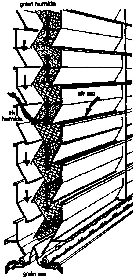 L'air chaud entre dans les gaines à partir d'une chambre de mise en charge latérale. Les gaines sont obturées alternativement côté chambre d'air chaud et côté chambre d'air usé, de sorte que l'air chaud sort par le dessous de la gaine et circule dans le grain jusqu'à ce qu'il atteigne la gaine de l'étage voisin par laquelle il est évacué vers la chambre d'air usé. La longueur du trajet de l'air est de 15 à 20 cm.