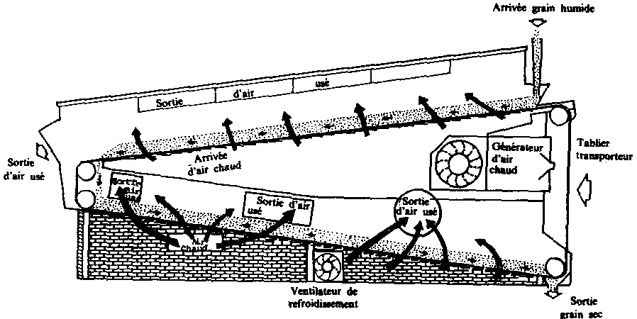 Les grains sont mis en mouvement par un tablier-transporteur continu formé de deux chaînes latérales reliées par des barrettes transversales. La vitesse d'avancement du tablier est réglable pour ajuster la durée du séchage à l'humidité du produit.