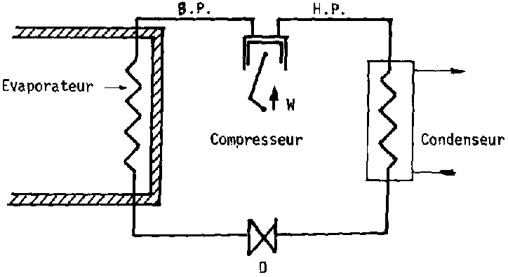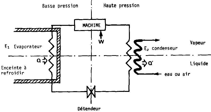 Le frigorigène se vaporise au niveau de l'évaporateur E1. Cette vaporisation consommant de la chaleur, c'est donc à ce niveau qu'il y a production de froid. Les vapeurs sont soutirées de l'évaporateur au moyen d'une «machine» M qui les envoie ensuite, en pression, au niveau d'un autre échangeur E2 où elles vont se condenser. C'est à ce niveau que la chaleur emmagasinée est rejetée à l'extérieur du système. L'échangeur E2 est appelé condenseur. Le frigorigène, alors liquéfié, retourne à l'évaporateur après avoir traversé un détendeur qui régularise le débit.