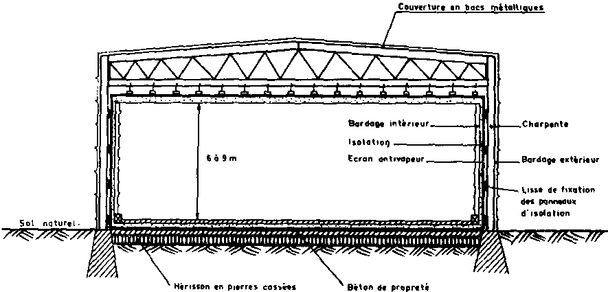 Une société spécialisée dans la construction de cellules métalliques étanches propose une technique intéressante de construction d'entrepôts frigorifiques de grandes dimensions. Les éléments préfabriqués métalliques sont assemblés par soudure et constituent des enceintes étanches. Les parois sont isolées intérieurement par deux couches de laine de verre recouverte d'un bardage intérieur en acier galvanisé ou en aluminium.