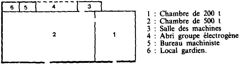 - pour la grande chambre (1 468 m³) de: 31468 frigories, assurée par deux groupes de 18 000 fg/h entraînés chacun par un moteur électrique de 12 ch.