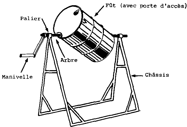 A un stade de technicité plus avancé, il est courant d'utiliser un fût métallique monté sur un axe excentré (poudreuse de type «baratte») (Fig. 215 a). Le Tropical Stored Products Institute a mis au point un mélangeur artisanal appelé «Fuffle» qui fonctionne par brassage dans un cylindre garni de chicanes. L'insecticide est déposé à la surface du grain dans le sac et le tout est déversé dans le Fuffle équipé d'une bouche d'ensachage à la sortie. Enfin pour les centres mécanisés existent des poudreuses motorisées comprenant une trémie à graine, une trémie à poudre, un cylindre mélangeur-élévateur et un dispositif d'ensachage.