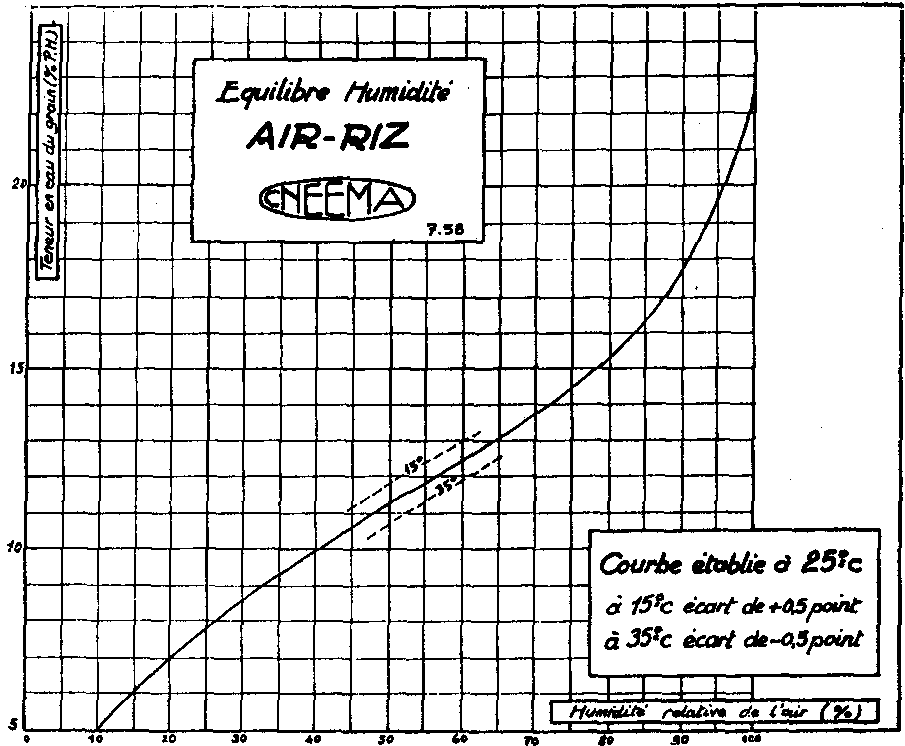 - la courbe d'équilibre air-riz pour déterminer, en fonction de l'humidité du riz et de l'humidité relative de l'air insufflé, s'il y aura séchage effectif et jusqu'à quel taux d'humidité (cf. Fig. 266).