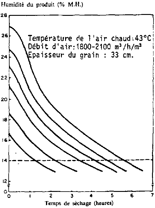 La température de l'air de séchage est de 43° C. Le débit spécifique de 1800 à 2 000 m³/h/m³ de grain.