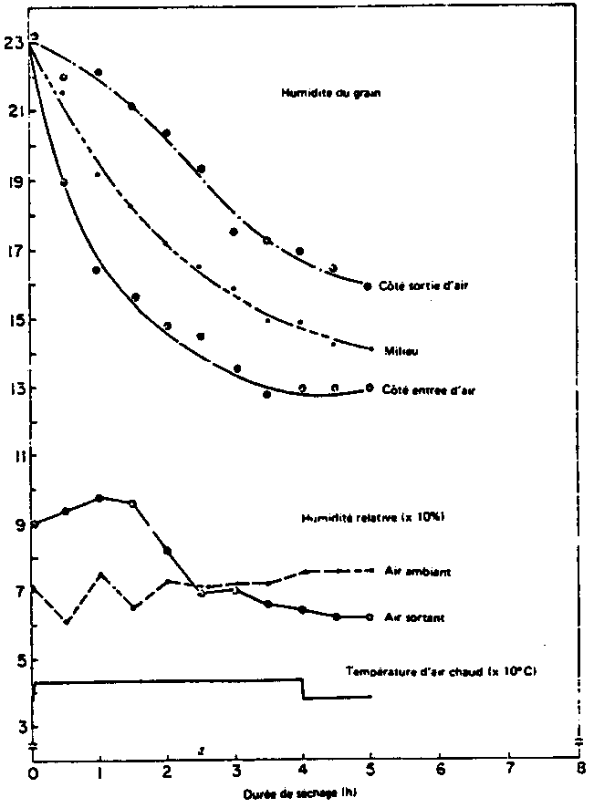 Il est possible de sécher avec de l'air à température élevée lorsque le grain perd facilement son eau. L'évaporation absorbe une forte quantité de chaleur, ce qui abaisse la température de l'air de séchage. Ceci est vérifié dans la pratique où l'on utilise de l'air d'autant plus chaud que le grain est plus humide et où l'on constate qu'à mesure que l'humidité du grain diminue, la température de l'air sortant du séchoir augmente.