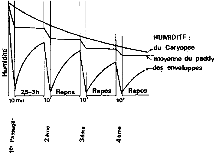 La température de l'air de séchage atteint 54° C pour du paddy destiné à la consommation (ne pas dépasser 43° C pour du paddy de sentence) et la durée d'homogénéisation varie de 6 à 24 h (10 Il en moyenne), alors que chaque passe de séchage dure de 10 à 30 mn.