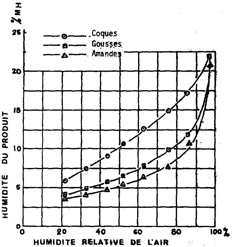 Les courbes d'équilibre air-arachide (Fig. 293) montrent des différences importantes d'hygroscopicité entre les amandes et les coques.