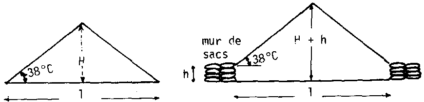 La largeur de la plate-forme permet de déterminer cette hauteur sachant que l'angle du talus naturel est de 38° (H = L/2 sin 38°). Cette hauteur peut être augmentée en constituant des murets en sacs de 1 à 3 m de hauteur (de 2 à 4 épaisseurs de sacs) (fig. 296).