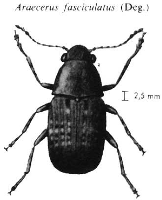 Le principal ennemi des stocks est une bruche Araecerus fasciculatus (Fig. 312) qui attaque préférentiellement l'Arabica, très sensible aux attaques à 80 % H.R. et 25° C à partir du 3' mois de stockage alors que Robusta reste pratiquement indemne pendant 9 mois.