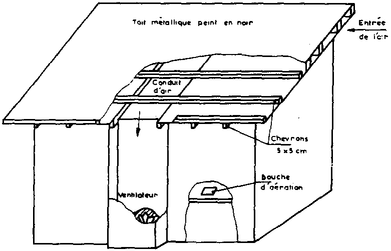 Il consiste à utiliser le toit du magasin comme collecteur de chaleur solaire et à ventiler le magasin avec l'air aspiré au travers du collecteur, Le collecteur lui-même est constitué de tôles ondulées peintes en noir et doublées au-dessous par des panneaux de fibres délimitant un espace de 6 cm entre les deux parois.