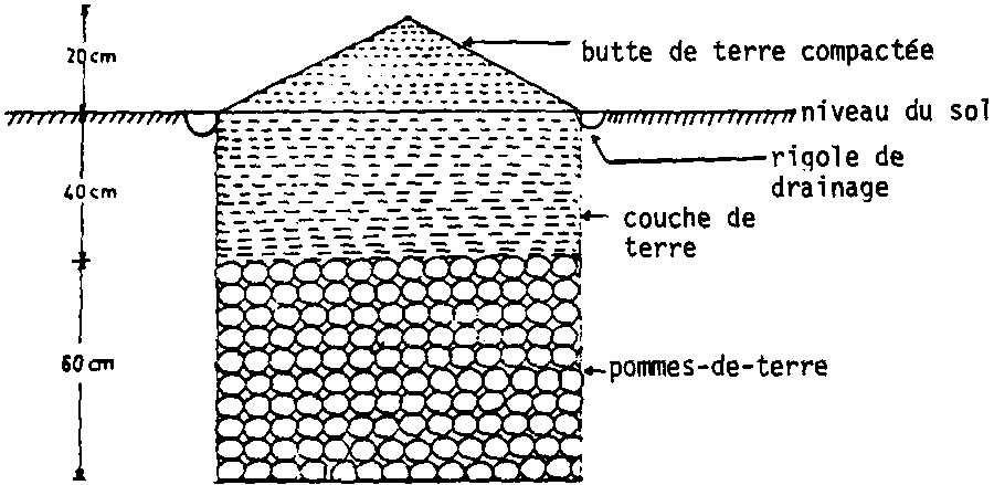 Les pommes de terre sont stockées dans un puits creusé dans le sol. Des expériences faites en Afghanistan ont conduit à retenir les dimensions suivantes: puits de 1 m de profondeur, couche de pommes de terre de 60 cm recouverte d'une couche de terre de 40 cm, ellemême surmontée d'un talus de terre compactée. Cette technique est utilisée pendant la saison froide et semble donner de bons résultats à condition que les tubercules soient retirés avant le radoucissement des températures.