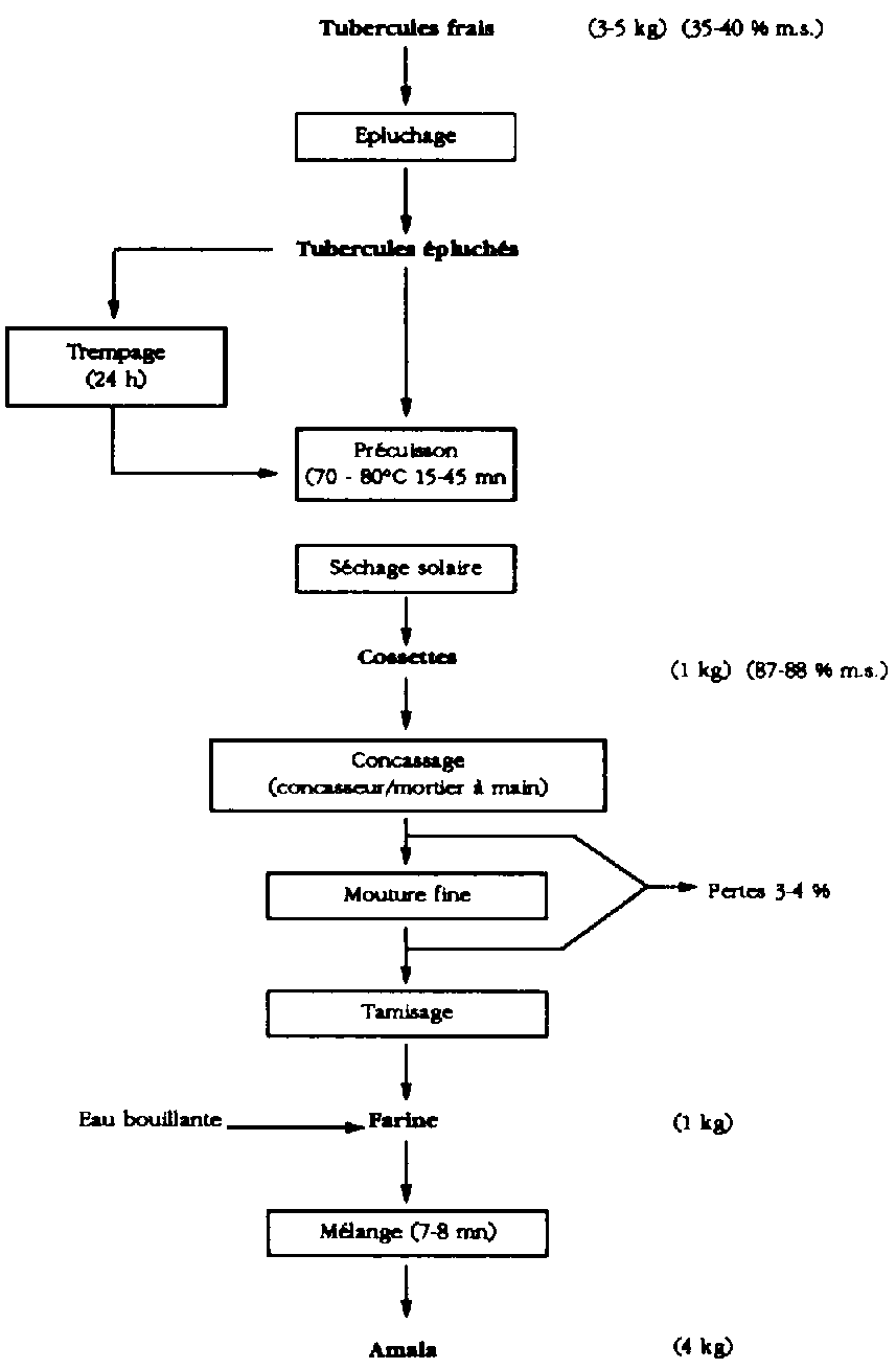 Cette technique consiste à éplucher les tubercules, les précuire à l'eau contenant des substances naturelles jouant par la suite le rôle d'antifongiques et d'insectifuges, puis les sécher au soleil, de préférence en période d'harmattan. La précuisson, précédée ou non d'un trempage, n'est pas systématique, en particulier au Nigeria (Ezeh, 1992). Dans ce cas, la possibilité de conservation est limitée à quelques semaines alors qu'elle peut s'étendre à plus d'un an lorsque les tubercules ont été précuits avant séchage. C'est essentiellement sous cette forme de tubercules séchés, entiers mais de petite taille ou en morceaux, que s'effectue la commercialisation vers les marchés urbains. Pour leur utilisation culinaire, les cossettes sont réduites en farine après concassage et mouture. La farine sert à fabriquer une pâte colorée (marron) à consistance élastique, "l'amala" - ou le "télibo", que les consommateurs distinguent du "foutou" et du "foufou" - ("igname pilée") préparés à partir de tubercules frais. Des préparations plus élaborées existent aussi comme le "wassa-wassa" connu dans toute la sousrégion (granules de farine) ou le "tubaani" du Ghana en mélange avec la farine de haricot.