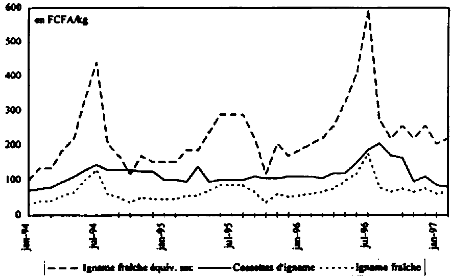 - Pour ces raisons, la disponibilité en igname fraîche sur les marchés est saisonnière et les prix au consommateur varient fortement durant l'année. D'après les données de l'ONASA au Bénin, on constate ainsi que les prix peuvent varier d'un facteur de 1 à 6 au cours de l'année comme le montre la Figure 2. Sur ce graphique, les prix de l'igname fraîche ont été convertis en prix équivalent pour un même taux de matière sèche que les cossettes et en comptant une perte de matière sous formes d'épluchures de 25 % du poids des tubercules frais.