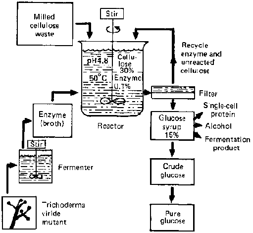 Although a number of fungi are cellulolytic, only a few produce cell-free cellulose in sufficient quantity to be useful for large-scale development. Trichoderma viride and a number of its mutants do produce a stable cellulose that is capable of degrading cellulose (Figure 3). The fungus grows rapidly on simple media in the pH range of 5.0 to 2.5, thus reducing to a minimum contamination from other microbes. The broth containing the enzyme is then mixed with pure cellulose, or with treated lignocellulose to remove the lignin, and a glucose syrup results.