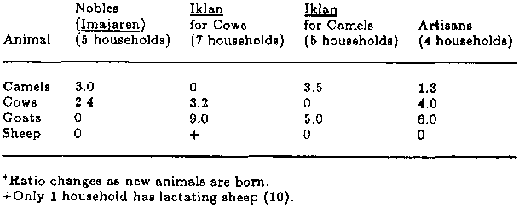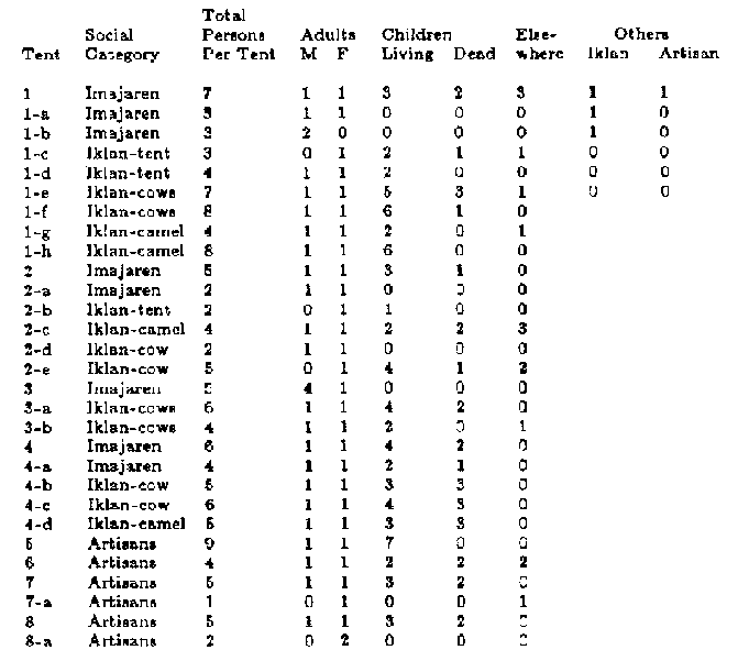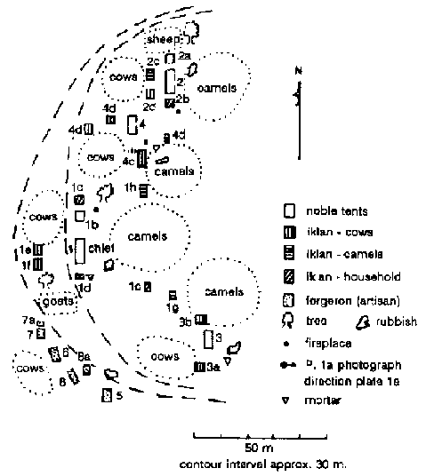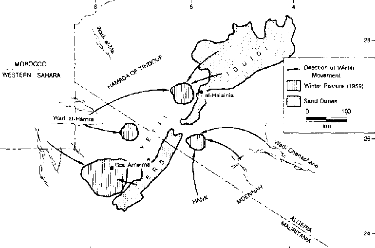 In 1959, the most favored areas were around the wells of al-Haiaina and Bou Ameima. Nevertheless, not all friqs went to the summer pastures in Yetti. A close check of the number of friqs present in the winter wadis (as shown in figure 1-1) indicates that nearly half failed to leave their winter locations. Admittedly, 1959 was a somewhat humid year, thus making local resources more attractive and perhaps reducing the desirability of moving. Also, the poor families, unwilling to face the potential risks involved in shifting their flocks to relatively unfamiliar territory, perhaps remained behind, while those possessing larger herds and greater ability to resist sudden catastrophe risked the migration. This points out the variation in patterns of movement that can be found within one tribe. The limited circulation of the poorer friqs around permanent water supplies and along the course of the wadi beds resembles the limited movement of the Kel Tamasheq.