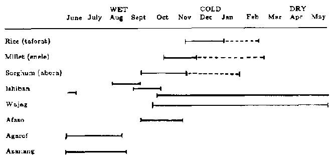 The combination of agricultural and pastoral activities is more complex among the Haiballah than in any other group. (25) Beginning with a gatna stop at al-Fejha in the Tamourt an-Naaj wadi (along the east side of the tribal territory), the Haiballah then move out onto the plateau during the rainy season. As they proceed northward and westward during the cool, dry season, they make stops at various agricultural areas to collect grain. Finally, as the hot season approaches, they move south into the acacia forest of Tamourt an-Naaj, where the leaves of the acacia trees form almost the sole pastoral resource during the hot, dry months. Yet, despite the importance of agriculture in determining where they are located at any time in the year, they remain essentially pastoral.