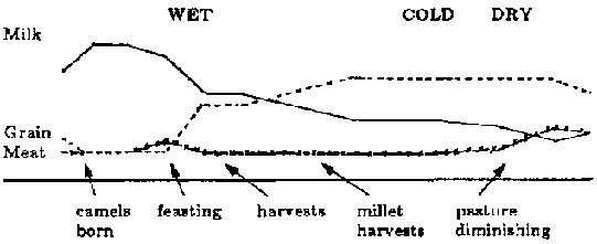 Further north, the mixture of pastoral and agricultural forms becomes more complex. Some tribes are strictly camel herders, with little or no interest in agriculture. For example, the Ahel Noh spend the cool, dry season in the southern part of their area, the dry, hot season in an intermediate zone of sand dunes, and the rainy season on the edge of the Dar in the north. (22) The location of the dry, hotseason pastures in a zone intermediate between the pastures of the other two seasons is quite unusual, but actually represents merely an adaptation to peculiar locally favorable resources - in this case, the water resources collected at shallow depths beneath the dunes.