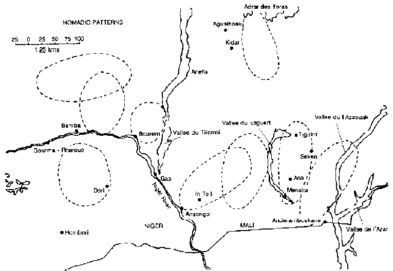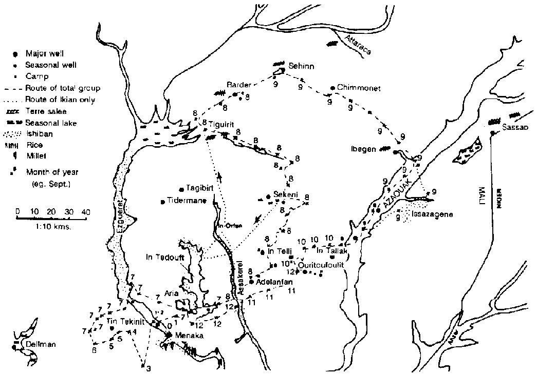 In conclusion, it seems significant that most of the nomads of southern Mauritania move in a roughly eliptical pattern. Occasionally, their outward and inward paths cross over each other, but it is more common for the herds to return to the dry-season wells by a route different from the one followed when leaving them. This difference in inbound and outbound routes is not commented upon in any of the literature, but it may be that the exhaustion of areas previously grazed during the year makes a selection of an alternative route desirable.