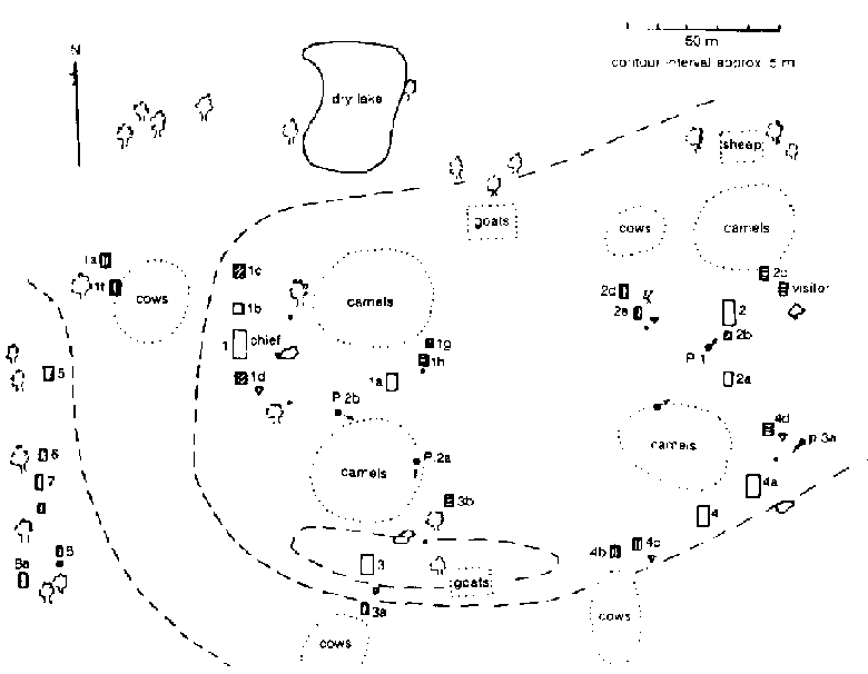 Once there is a definite rainfall, scouts are sent out to determine the precise part of the hamada in which the rainfall and resulting vegetation are best. (13) A variety of different moves, or no moves at all, are possible. If precipitation fails, the herder will move great distances to the very borders, or beyond the borders, of the tribal territory. If rain is especially abundant near the summer grazing areas or if the flock is composed of animals incapable of withstanding the rigors of long-distance migration, the nomad may not move at all. In general, however, assuming a year of average rainfall, there is a movement from the summer grazing areas on the flanks of the surrounding ridges into the hamadas and regs in the center. The precise area selected for winter grazing may vary from year to year, but the overall pattern of movement from summer wells to winter pasture in the interior desert remains unchanged. The area selected depends on whether that zone has received sufficient rainfall. (14) If so, friqs from different sections concentrate around the favored area.