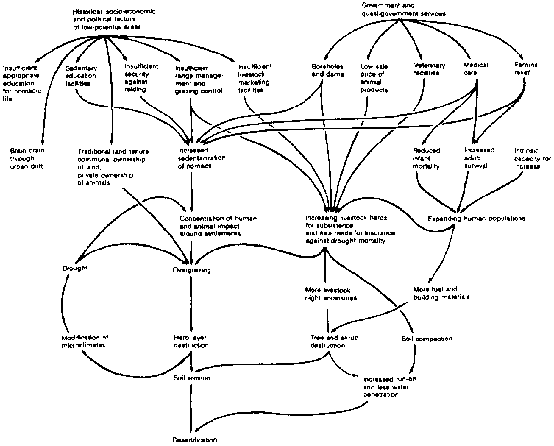 The desertification process is a complex web of environmental disturbances, and its control is confounded by a labyrinth of social and ecological complications. "Modernization" has reached a stage in the Sahel such that a return to traditional ways would not be possible, even if desirable, as a means to check the "desert creep." It is in the interest of the developed world to work with the affected countries to find an ecologically sound and socially acceptable solution to the degradation problem. The ecological understanding necessary to apply conservative land management is available, but because of social and cultural differences the framework within which it may be properly applied has not yet been developed.
