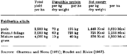 Charreau and Vidal (1965) calculated that under Faidherbia albida trees in Senegal, millet production was 2.5 times that of crops grown in the open, and protein content of the grain was up to 4 times greater. Dancette and Poulain (1968) demonstrated that peanut production can be 36.7 percent greater under the influence of Faidherbia albida.
