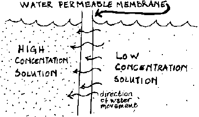 Water in the soil is taken up by the roots through a combination of osmosis and cohesion. Osmosis is the pattern of water movement across a water-permeable membrane such as the cell membrane. If two liquids are separated by such a membrane, water will move out of the more dilute solution, the one with a lower concentration of solutes like salt, and into the more concentrated solution (Figure 5.2). This movement will continue until both solutions have the same concentration of solutes per volume of water. If the concentration of solutes is greater in the root cells than in the soil, water will move into the roots. Water loss from transpiration increases solute concentration in the leaves and so water continues to be pulled up through the plant by osmosis.