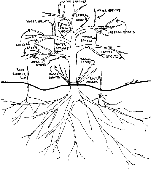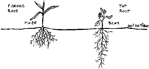 There are two easy-to-identify patterns of root growth: fibrous and tap roots (Figure 5.4). Fibrous roots spread out and downward in a mass of fine roots, none of which dominate. Fibrous root systems include many secondary and tertiary roots, or lateral roots, those that grow out of an older root and therefore do not tend to grow straight down (refer to Figure 5.1 in section 5.1). Monocots like maize and sorghum commonly have fibrous root systems. Garden crops that are dicots, for example, carrots, okra, chilis, sweet peppers, and amaranth, have a tap root, a dominant vertical root with other smaller roots growing out from it. These tap roots can make use of water deep below the soil surface. Many dryland fruit trees such as carob and olive also have a tap root. When the tap roots of mature plants are cut off, for example, in transplanting, the plants may die. Some of these plants can recover by developing alternative roots in a pattern similar to a fibrous root system. However, this will only occur if the plant is young, vigorous and its shoot system is relatively small.