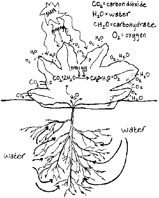 The carbohydrates produced by photosynthesis are broken down into the simple sugar glucose, which then combines with oxygen to produce CO2, water, and energy. This process, called respiration, provides the energy necessary for the plant to live and grow.