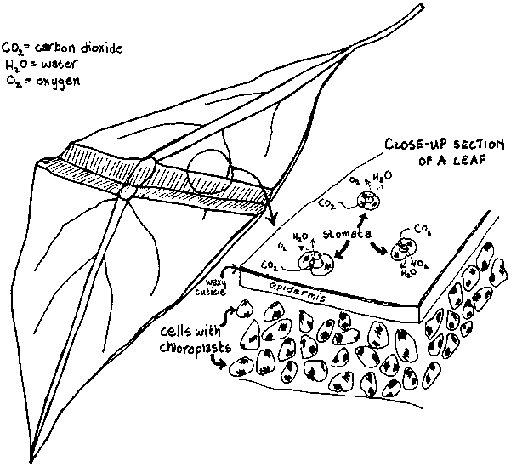 For photosynthesis to occur carbon dioxide (CO2) must enter the chloroplasts, most of which are found in the cells under the plants epidermis. Most CO2 enters the plant through the stomata (singular is stoma), tiny holes in the epidermis which can close (Figure 5.6). When the stomata are open not only can CO2 reach the chloroplasts, but moisture from the inside of the leaf is able to evaporate into the environment. This movement of water vapor through the plants stomata is called transpiration. As water evaporates from the leaves during transpiration, the concentration of nutrients in the surface cells increases compared with that in adjacent cells, from which water then moves by osmosis. The same process is repeated all the way down to the roots. Because of the great cohesiveness of water and its adhesion (the attraction between dissimilar substances) to the cells of the passages along which it moves to the leaves, the water is pulled upward from the roots to the leaves. The energy that keeps this water moving upward is supplied by the sun which causes evaporation of water from the plant during transpiration.