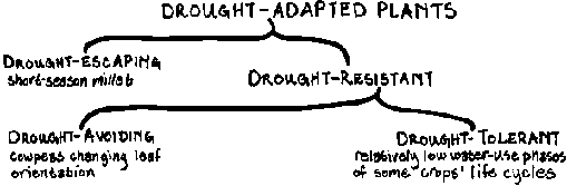 Drought-adapted plants either escape drought or resist it in some way (Figure 5.8). Drought-escaping plants have short, rapid life cycles, allowing them to take advantage of brief periods of adequate moisture and decreasing their chance of experiencing drought. Some famine crops like short-season millet varieties and tepary beans follow this strategy, maturing before late season drought sets in.