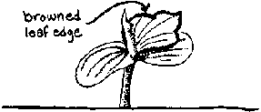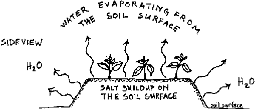 The accumulation of salts can be a serious problem in dryland gardens and agriculture. Discussion of salty soils and water, and related management techniques can be found in section 9.3.1, Box 11.1 in section 11.2, and section 12.6.2. Whatever the source of salts, when they become concentrated in the soil they have an osmotic effect on plants. This results in a slower uptake of water and changes in hormone production leading to lower rates of transpiration and photosynthesis and increased respiration. The browning of leaf edges described in section 13.4.2 is a sign of this (Figure 5.9). Eventually under saline conditions, insufficient energy is available for the plant to grow or even maintain itself, and it will die.