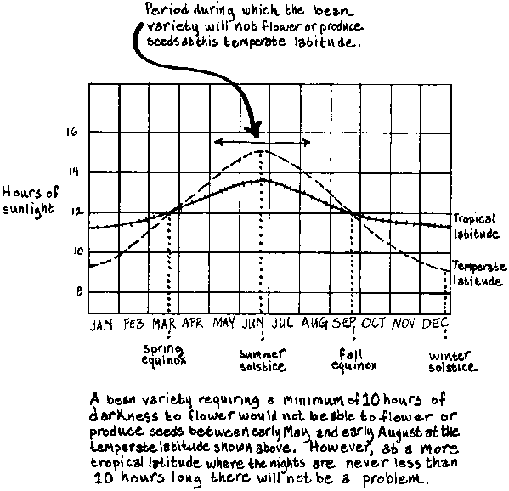 Closer to the equator there is less difference between hours of darkness and hours of daylight, both daily and seasonally. It is not unusual to find crop varieties from the tropics and subtropics with longer darkness requirements than varieties from higher latitude areas. For example, when grown in the northern Sonoran Desert where we live, some beans from central and southern Mexico will not flower until September, even if they are planted in March. This is because we live farther north where the longer nights the beans need to flower do not occur until September, the beginning of the cool season (Figure 5.10). Because beans are warm-season crops they cannot be sown early enough in the year to take advantage of the long nights of late spring. Therefore the only time for us to plant these varieties is in the late warm season, late July or early August, and this does not give some beans enough time to mature before the freezing weather in November.