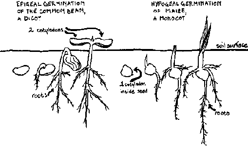 Dicots and monocots are the two major groups of garden plants. Their vascular systems are arranged differently. Dicots are those plants such as beans, cucurbits, amaranths, and many fruit trees which have two cotyledons, or seed leaves, in their seeds, and branching leaf veins. Monocots have only one cotyledon and usually the veins in their leaves are parallel to each other, running the length of the leaf as in maize, onions, date palms, and most cereals. In larger seeds the difference between a monocot and a dicot is obvious. For example, a bean seed can be easily split into two halves, the cotyledons. A maize seed, however, does not split because it has only one small cotyledon.