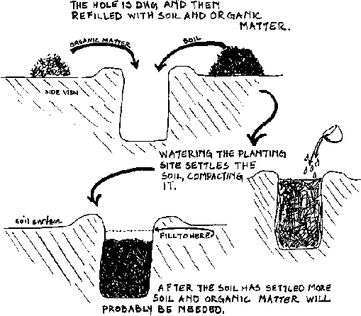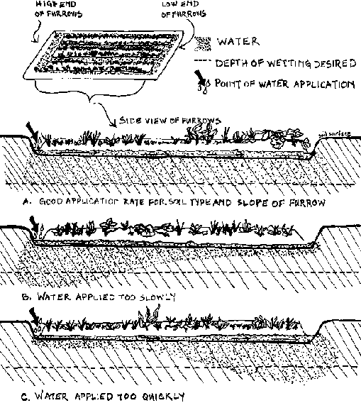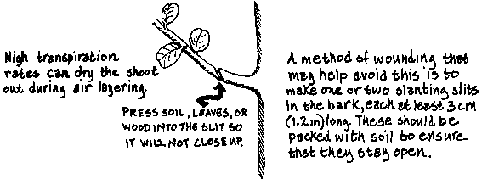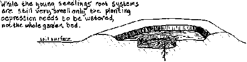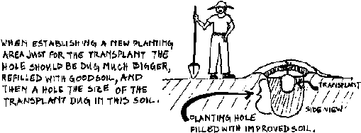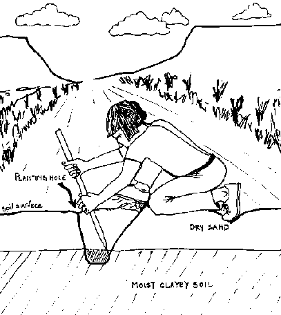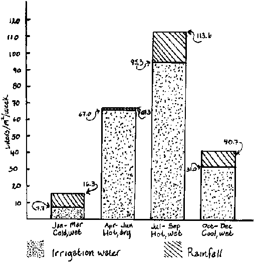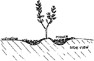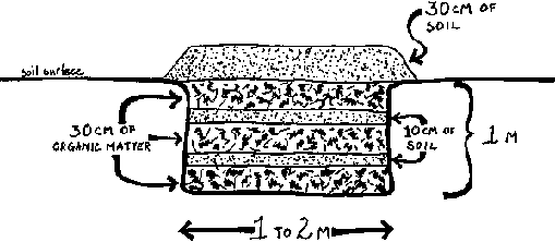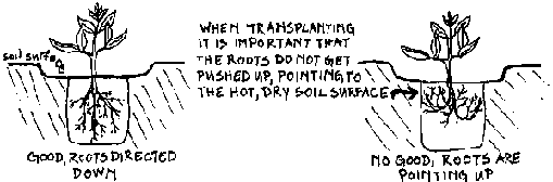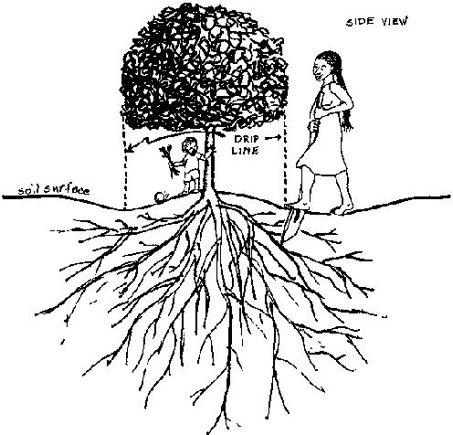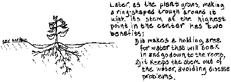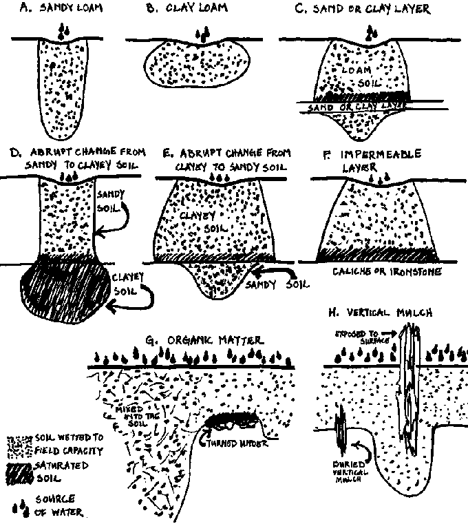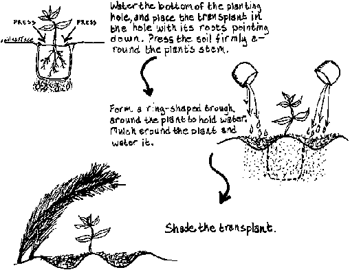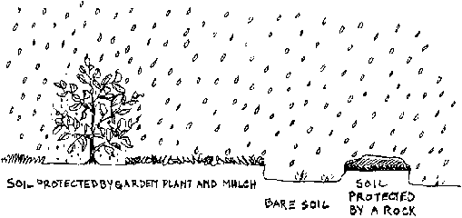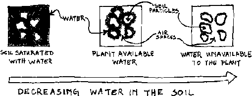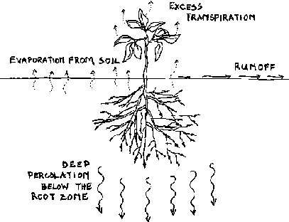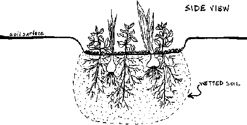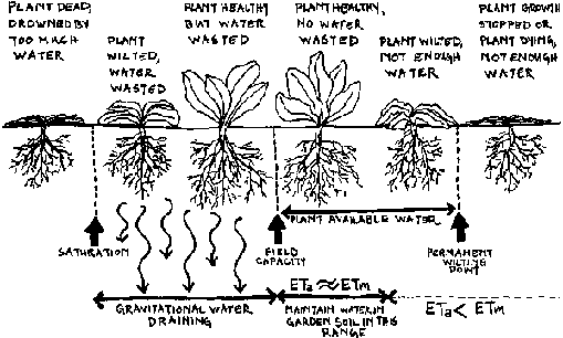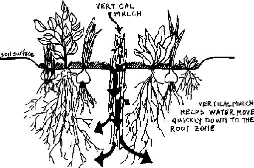 Under sunny, dry, hot conditions transpiration rates are extremely high. If the soil is unable to provide enough water to keep up with the rate of transpiration the plant will wilt. If this water loss is not replaced soon, the plant will die. By shading, mulching, and providing garden plants with protection from drying winds the gardener reduces the need for water and so the amount of water that will be lost to transpiration (section 10.8). Directing water down to the roots, for example, with vertical mulch (section 10.8.2), minimizes the amount lost by evaporation from the soil surface, and makes more water available to meet the plants needs. Gardeners also use plants with lower rates of transpiration and other characteristics that make them better able to survive and produce under dryland conditions.
