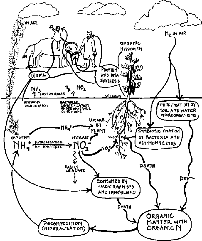 From the soil roots obtain nutrients such as nitrogen and phosphorus which are essential for healthy plant growth. In some cases this is made possible through mutually beneficial or symbiotic relationships between plant roots and soil microorganisms. Mycorrhizae (Box 9.5 in section 9.5) symbioses enable plants to use more of the phosphorus, zinc, or copper in the soil.1 Symbiosis between Rhizobium bacteria and roots of legumes makes nitrogen in the air available to the plant while also enriching the soil (section 9.5.2).