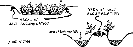 Some plants are less sensitive to salt accumulations than others and are referred to as being salt tolerant. Halophytic (salt-loving) plants actually like salty growing conditions, producing more as salinity increases to low levels. Some salt-tolerant dryland garden crops are beets, asparagus, cowpeas, spinach, date palms, and some tomatoes.4 There are also many salt-tolerant indigenous crops and wild plants, and new salt-tolerant varieties of widely grown crops are also being developed.5 Plants that are particularly sensitive to salinity such as the stone fruit and citrus trees are called halophobic.