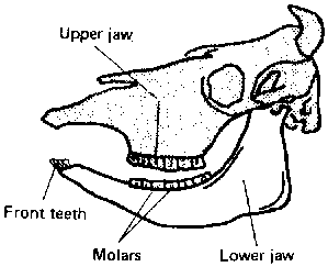 · Let us look at a cow's mouth. There are two jaws and a tongue. The upper jaw has no front teeth. The lower jaw has eight front teeth. The older the animal is, the more the teeth are worn. You can tell the age of a cow by looking at its front teeth.