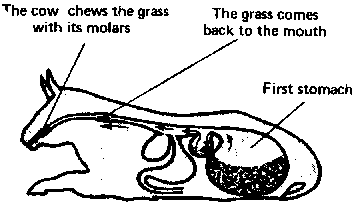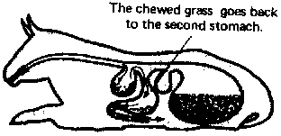 When the cow has bitten off the grass, it does not chew the grass at once with its teeth; it swallows it. The grass goes into the first stomach (or rumen).