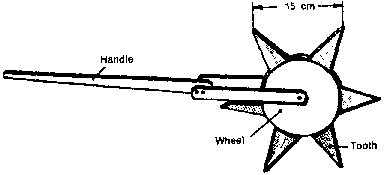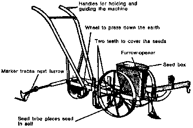 This can be made of wood or of iron. Each tooth makes a little hole in the soil. Put a seed in each hole, and cover the seed with a little earth, either with the hoe or with your foot.