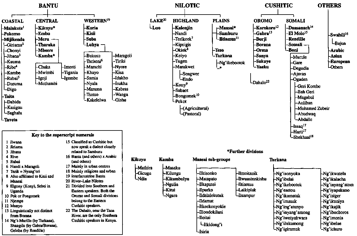 The population of Kenya is also characterized by high diversity. Kenya is a meeting point of three major groups of people: Bantu, Nilotic and Cushitic speakers, each with a diversity of ethnic groups (see Map 1 and Table 1). Altogether, there are over 55 distinct languages and several hundred dialects. Some of these ethnic groups, such as the Kikuyu and Luo, comprise many millions of people, but others, like the Suba and El Molo, are small and their languages are on the verge of extinction. These original inhabitants of Kenya were later joined by people from other continents, e.g. the Arabian peninsular, India and Europe, thus further diversifying the linguistic and cultural situation. With the passage of time, and through observation and trial and error, a wealth of knowledge and experience about the environment, its resources and how best to exploit them was accumulated-for example, knowledge about the uses of plants as food, medicine and as poisons. This deep-rooted indigenous knowledge is necessary for the survival and well-being of a community in its environment. The Mijikenda, for example, use over 80 local species of plants as leafy vegetables, while the Turkana exploit over 140 species of edible plants obtained from their arid environment.