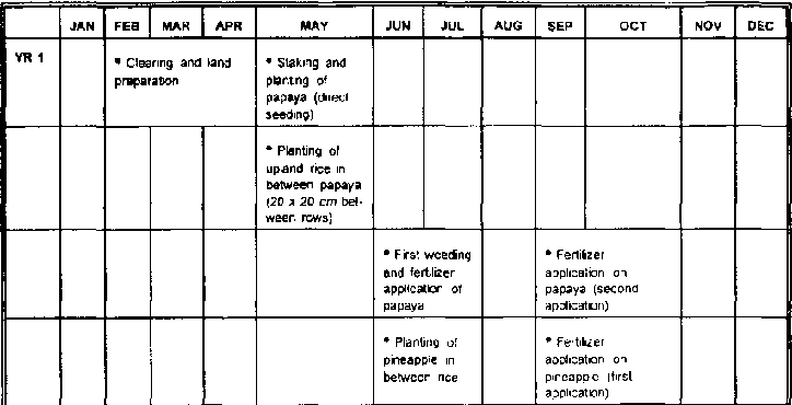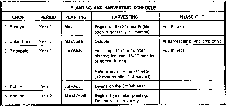 The above combination, however, is sequentially established. It usually starts with a core pattern depending on land ownership and financial capabilities. These are (1) coconut + papaya + pineapple and (2) coconut + papaya + pineapple + coffee + banana. All over annual indoor permanent crops are introduced after the first harvest of pineapple is made, 14-18 months. In some cases, fruti trees like lanzones, jackfnuit, mango, santol and others are either planted earlier or are already established in the field. A step-by-step outline of the sequential planting strategy used by farmers is shown in Table 10. The upland rice, which will be eventually replaced even as the coffee seedlings are planted, and the pineapple crops which will replace it keep the soil in between the coffee (usually grown on slopy land) covered and protected from erosion But, more importantly, along with the interplantings of papaya, it brings in income even in the first few years when the coffee is still getting established and too young to bear fruit. The choice of pineapple, which will occupy the land for most of the first two ro four years, is based on sound principles of ecology and economics. Pineapples are drought-tolerant and also typhoon-resistant. Pineapples compete well with weeds, and eventually, when established, will smother the growth of weeds cuffing down the weeding costs entailed in any young coffee plantation. Pineapple residue is used in cattle feed. Finally, insects and diseases are minimal. The papaya and cuttings of Gliricidia septum provide shade to the area.