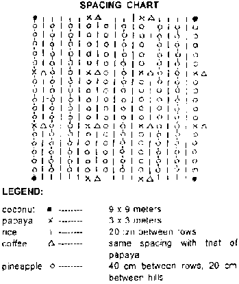 1. coconut + papaya pineapple + banana + taro2. coconut + upland rice + pineapple + daisy + banana + sweet potato + chayote + ginger