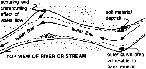 River/stream bank erosion is the scouring, undercutting or the collapse of banks of water caused by the flow of water. The factors that contribute to this type of erosion are the soil type, the velocity and the volume of water.