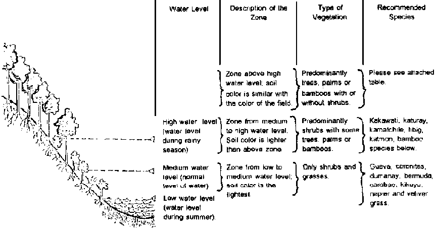 2. In the zone from medium to high water level, some tree, palm or bamboo species can be planted with grasses and shrubs.