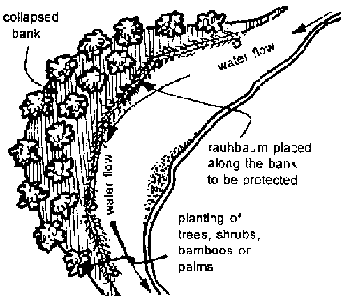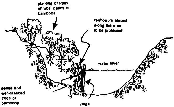 1. Rauhbaum Method -- This is the placing of dense and well-branched trees, tree tips or bamboos along the bank. It is tied and anchored by a strong peg and the butt end is pointing upstream. This measure is used to protect the bank from the direct impact of water flow while waiting for the establishment of the more permanent stabilization measures.