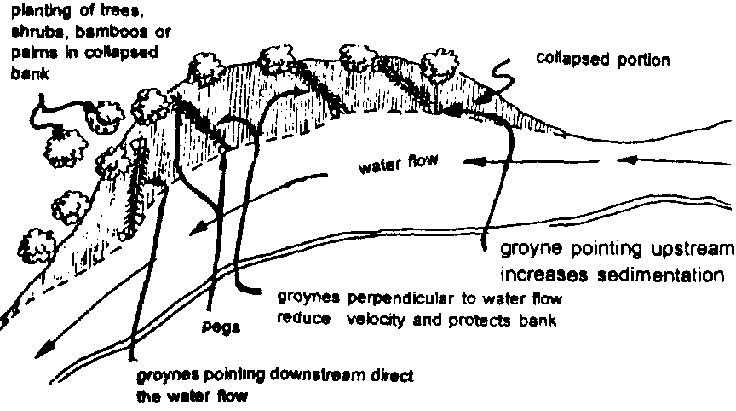 2. Temporary Groynes -- A series of temporary structures of dense and well-branched trees, tree tops or bamboos are used. These structures are placed pointing upstream, perpendicular to the flow of water and pointing downstream in order to direct the direction of flow, reduce the velocity of water and partly accept the deposition of soil sediments. The measure is used only in wide and shallow rivers or streams.
