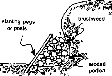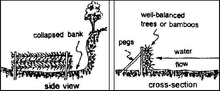 3. Plugging of river/stream bank - This is a temporary, measure to protect banks that are in danger of collapsing by placing dense crowns of brushwood supported by pegs along the eroded portion.