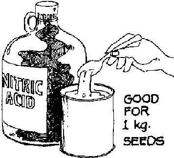 · Soak 1 kg of seeds for 16-24 hrs in 1 liter nitric acid solution (HNO3) prepared by pouring 1 1/4 tsp (6.3 ml) concentrated nitric acid (of 68% purity) into a liter of water (a motor oil can = 1 liter). After soaking, sundry seeds for about 3-7 days.