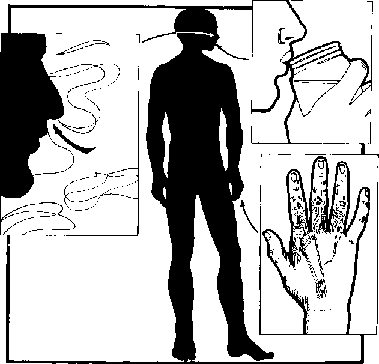 Know the three paths poisons use to enter the body. You can breath in pesticide fumes or dust. Your skin will absorb pesticides and you can accidentally swallow pesticides.