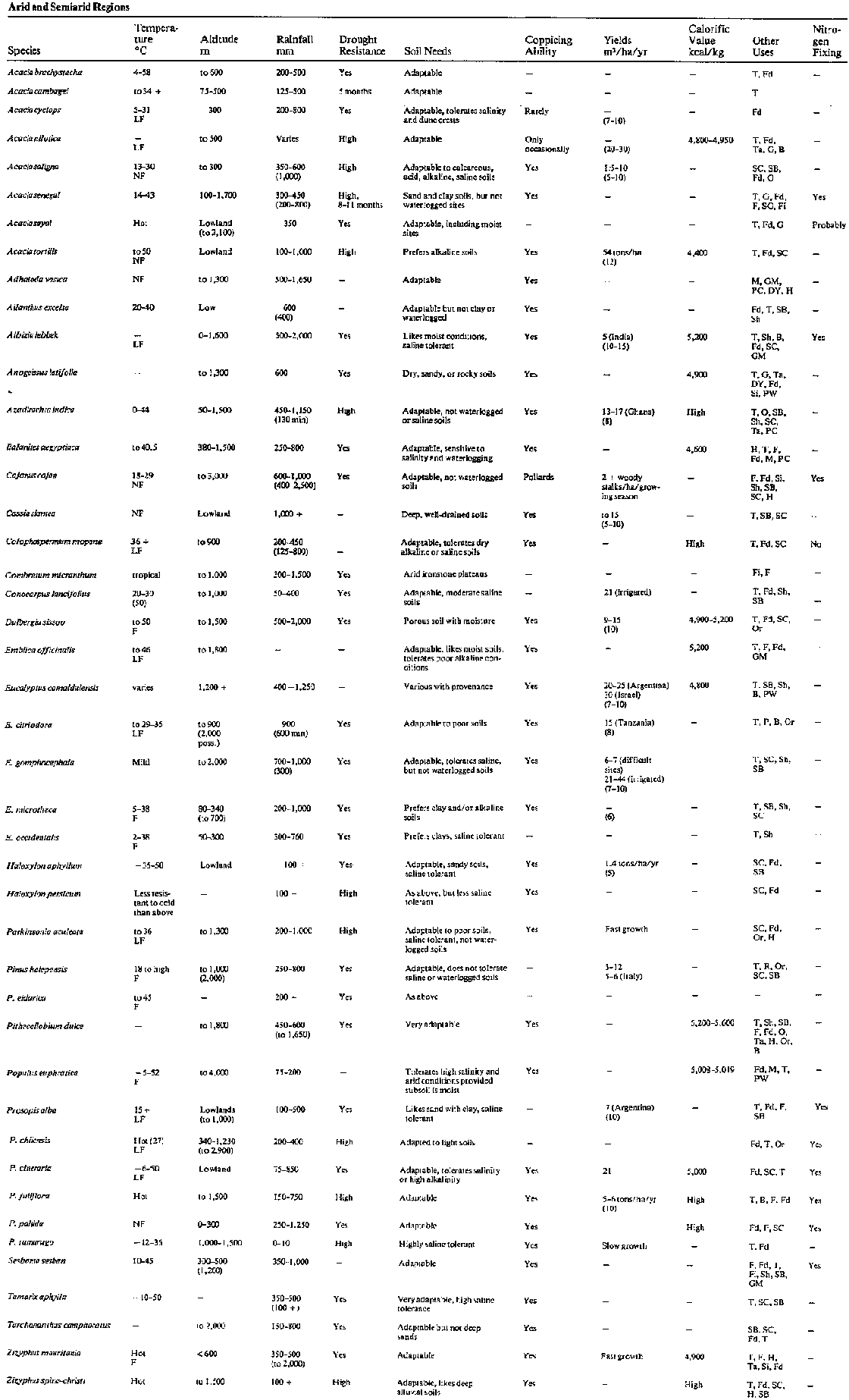The table following reviews the attributes of the various species duscussed in each section of Volumes I and II of Firewood Crops: Shrub and Tree Species for Energy Production. It only includes data contained in the two reports: environmental requirements, yields, calorific values, other uses (uses other than for firewood), coppicing abilities, and nitrogen-fixing abilities.